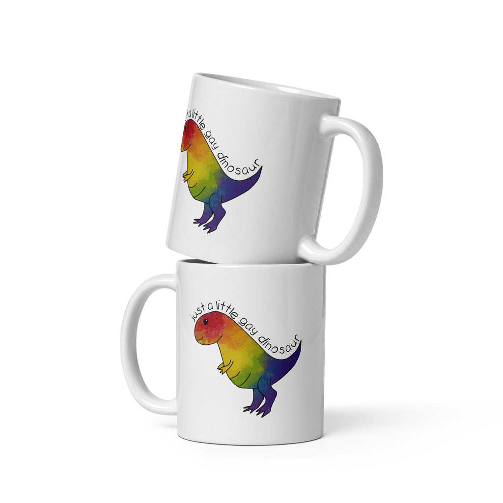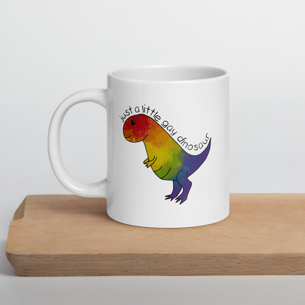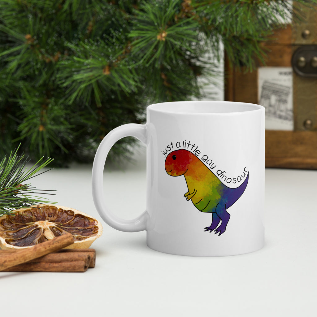This fun "just a little gay dinosaur" mug is the perfect thing to show your pride and put a smile on your face. It's a great gift for any member or ally of the community, or just for you! It’s dishwasher-safe and perfect for everyday use.